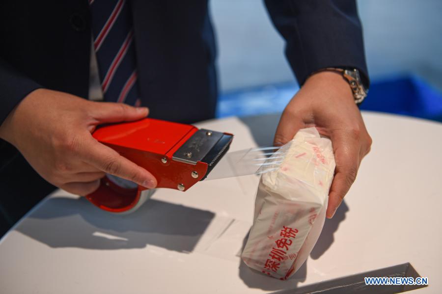 A staff member packs a piece of offshore duty-free good at a duty-free shopping mall in Haikou, south China's Hainan Province, Feb. 14, 2021. (Photo/Xinhua)