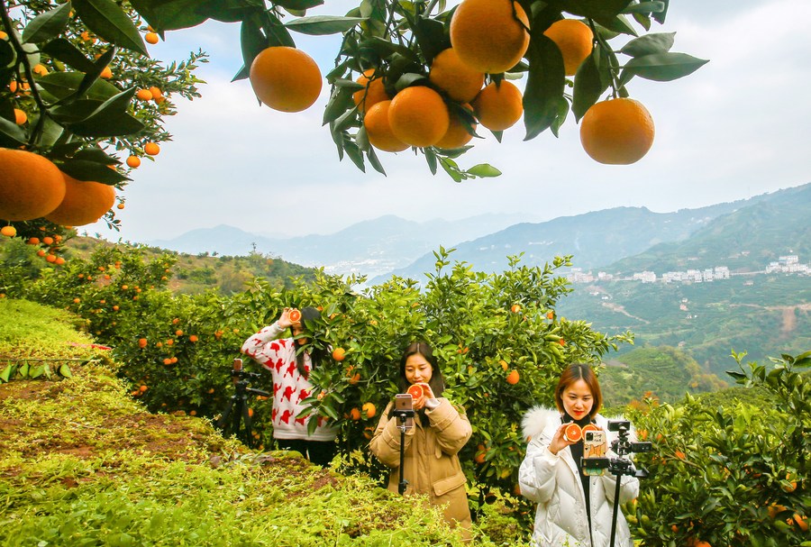 E-commerce livestreamers promote navel oranges at an orange plantation in Leigutai Village of Guojiaba Township in Zigui County, central China's Hubei Province, Dec. 4, 2020. (Photo/Xinhua)