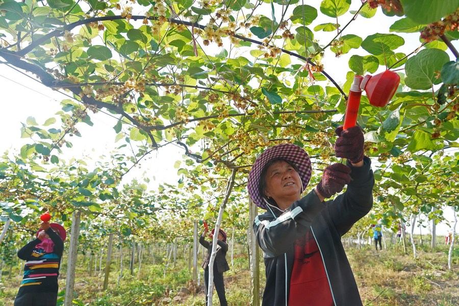 Villagers pollinate the kiwi fruit trees at a kiwi fruit industrial base in Chengxia Village of Fengxin County, east China's Jiangxi Province, April 29, 2020. (Xinhua/Wan Xiang)