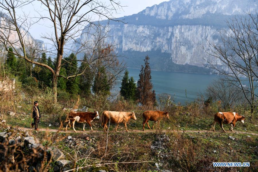 Yang Kaiji of Miao ethinic group returns with pastured cattle in Huawu Village, Qianxi County of Bijie City, southwest China's Guizhou Province, Feb. 20, 2021. Located in the deep mountainous area of Xinren Miao Township of Guizhou, Huawu Village is famous for its amazing landscapes. In recent years, with the efforts of local government, the village develops planting, cultivation, and tourism while relocating poverty-stricken people. Nowadays Huawu has taken on a new look in the new year, with various industries greeting booming development. (Xinhua/Yang Wenbin)