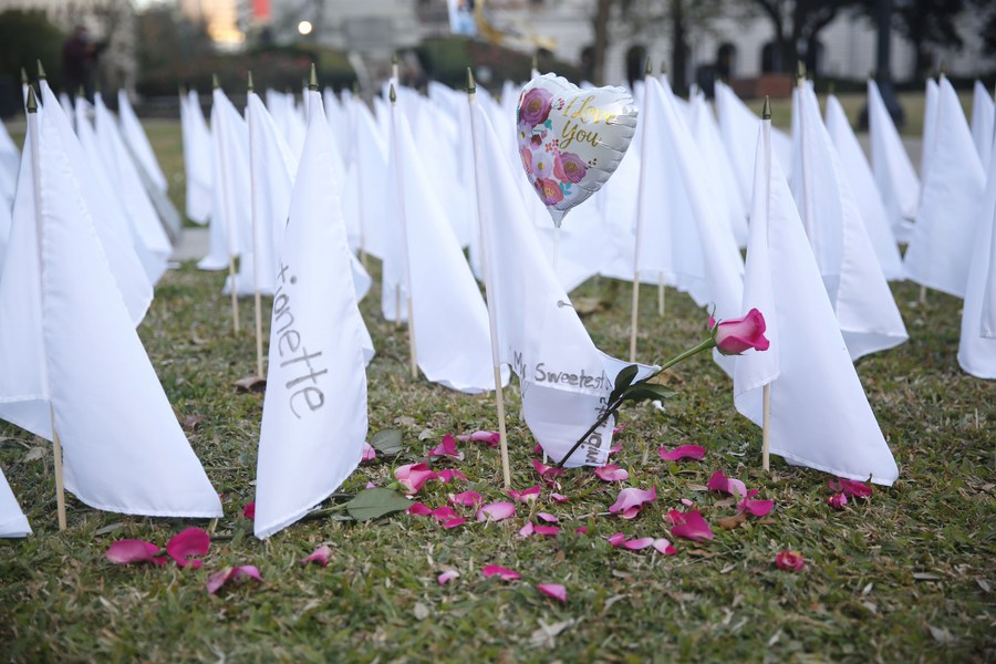 A memorial service for people who lost lives to COVID-19 is held in New Orleans, Louisiana, the United States, Jan. 19, 2021. (Photo by Lan Wei/Xinhua)
