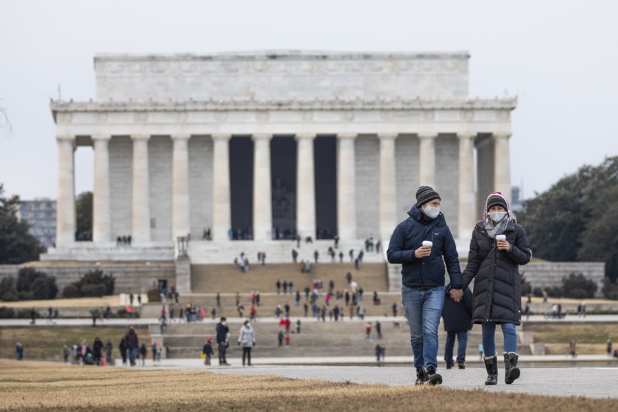 People wearing face masks visit the Lincoln Memorial in Washington, D.C., the United States, Jan. 24, 2021. (Photo by Aaron Schwartz/Xinhua)