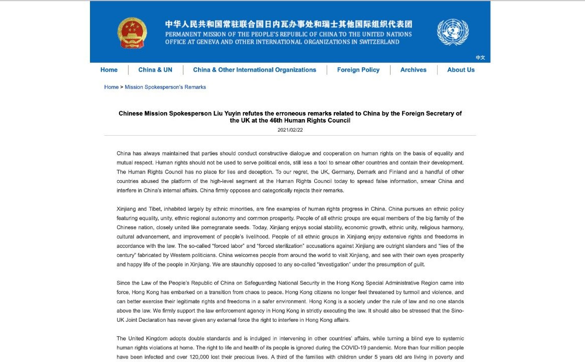 Chinese Mission Spokesperson Liu Yuyin has refuted the erroneous remarks related to China by the Foreign Secretary of the UK during the 46th Human Rights Council.