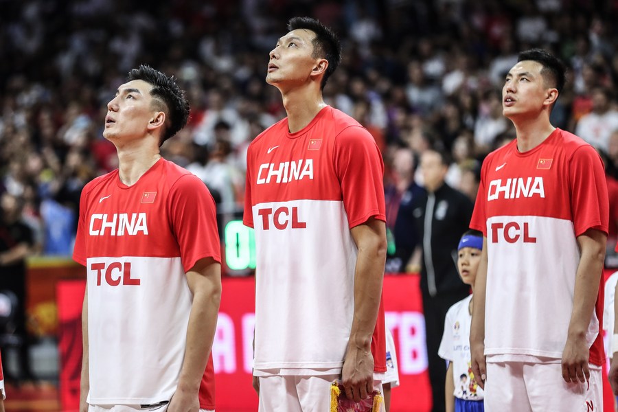 Yi Jianlian (C) sings Chinese national anthem before China's group M match against Nigeria at the 2019 FIBA World Cup in Guangzhou, south China's Guangdong province, Sept. 8, 2019. (Xinhua/Pan Yulong)