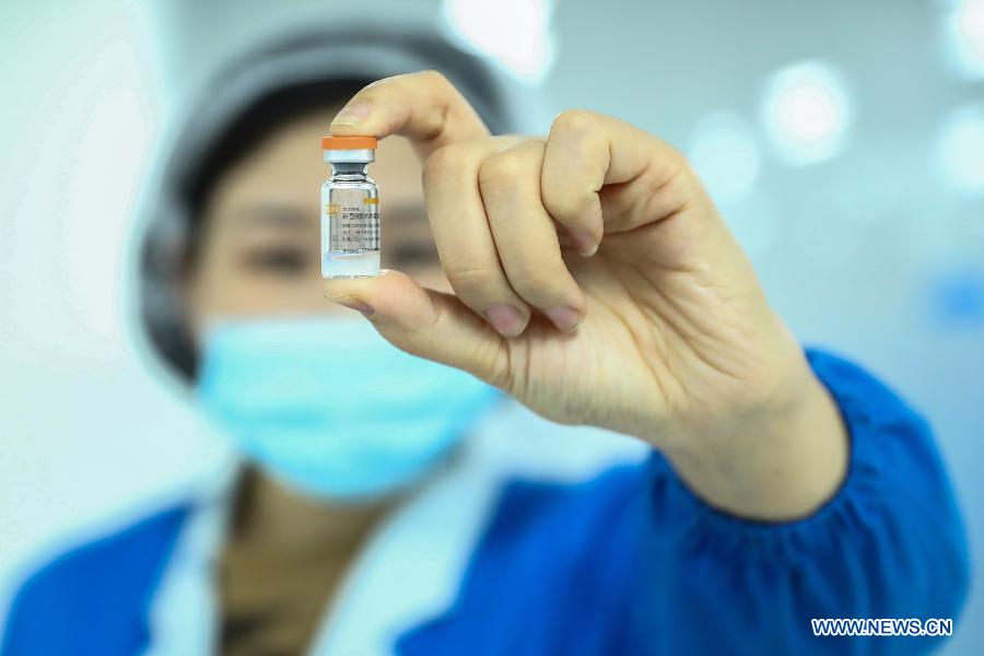 A staff member of Sinovac Biotech, a Chinese biopharmaceutical company, displays a dose of COVID-19 inactivated vaccine in Schering bottle package in Beijing, capital of China, Dec. 23, 2020. China's National Medical Products Administration on Friday granted conditional market approval to CoronaVac, an inactivated COVID-19 vaccine developed by Sinovac Biotech, the company said on Saturday. (Xinhua/Zhang Yuwei)