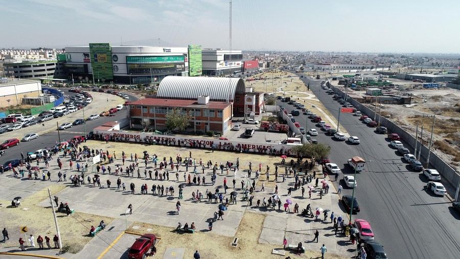 Aerial photo shows citizens waiting in line to receive the COVID-19 vaccines developed by Chinese pharmaceutical company Sinovac at a vaccination site in Ecatepec, Mexico, Feb. 22, 2021. (Photo by Francisco Canedo/Xinhua)