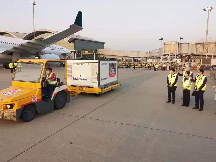 First batch of mainland-manufactured COVID-19 vaccines arrived in Hong Kong, south China on Feb. 19, 2021. (Xinhua/Li Gang)
