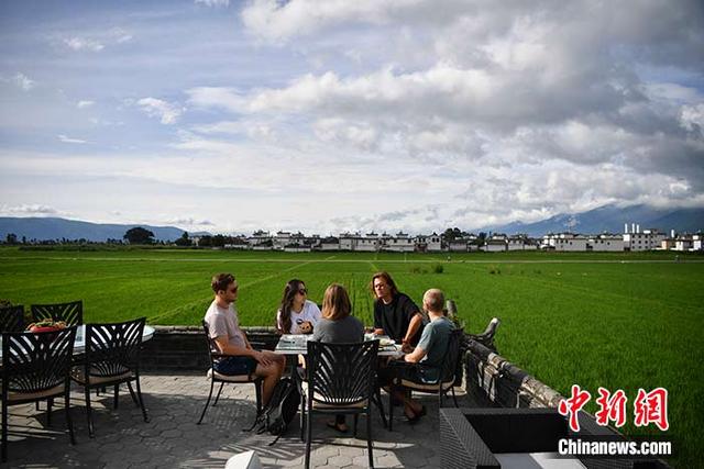 Linden (2nd R) talks with visitors at Linden Centre, a boutique hotel in Xizhou town. (Photo/Chinanews.com)
