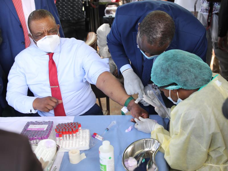 Zimbabwean Vice President and Health Minister Constantino Chiwenga (L) takes a blood test before receiving the Sinopharm COVID-19 vaccine, at a hospital in Harare, Zimbabwe, on Feb. 18, 2021. (Xinhua/Shaun Jusa)