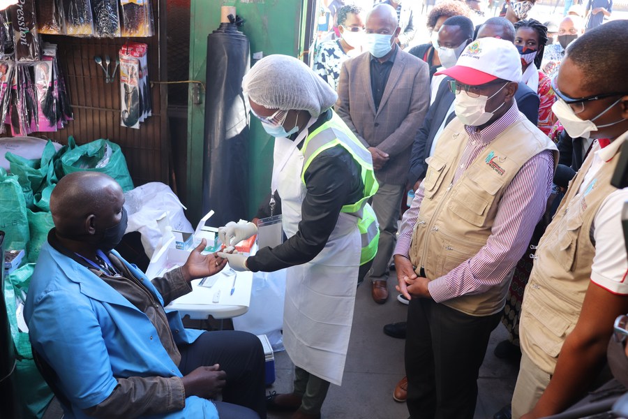 A health worker collects blood sample for COVID-19 antibody test in Maputo, Mozambique on Aug. 3, 2020. (Xinhua/Israel Zefanias)