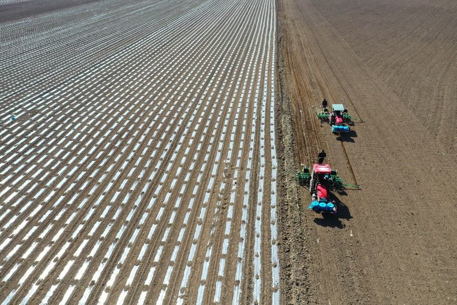 Aerial photo taken on March 25, 2020 shows seeding machines working in the fields in Qapqal Xibe Autonomous County, northwest China's Xinjiang Uygur Autonomous Region. (Xinhua/Sadat)