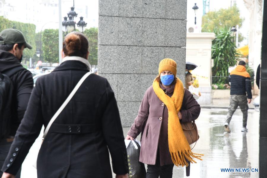 Tunisians wearing face masks walk on a street amid the COVID-19 pandemic in Tunis, Tunisia, Feb. 13, 2021. (Photo by Adel Ezzine/Xinhua)