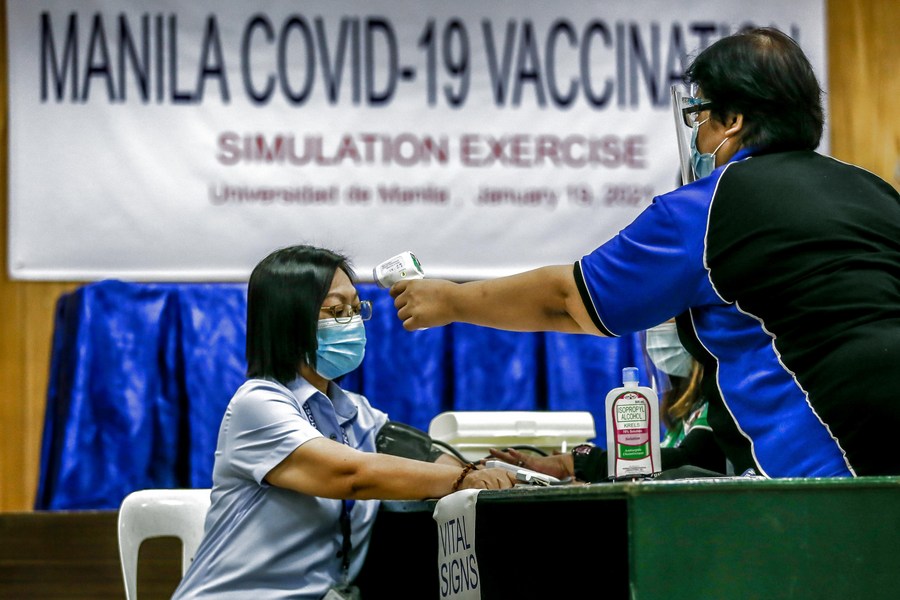 A woman wearing a protective face mask has her temperature checked during a COVID-19 vaccination simulation exercise in Manila, the Philippines, Jan. 19, 2021. (Xinhua/Rouelle Umali)