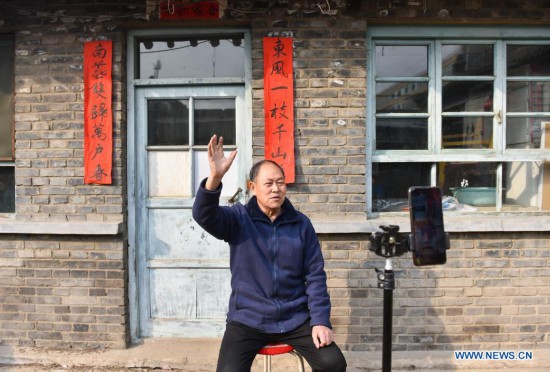 Hao Laixi introduces Ekou Naoge performance via live streaming in Haojie Village of Daixian County, north China's Shanxi Province, Feb. 24, 2021. 73-year-old Hao is an inheritor of the national intangible cultural heritage Ekou Naoge performance, an art form integrating dancing, music, art with acrobatics. It is a local tradition to perform Ekou Naoge during the celebration of the Lantern Festival. This year, Hao decided to present an online performance for the festival at the suggestion of his son and grandson. (Xinhua/Chai Ting)