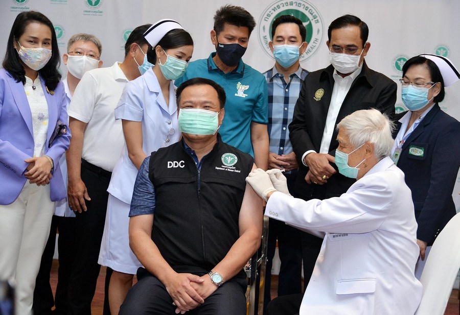 Thailand's Deputy Prime Minister and Public Health Minister Anutin Charnvirakul receives a shot of COVID-19 vaccine from China's Sinovac in Bangkok, Thailand, Feb. 28, 2021. (Thai Government House/Handout via Xinhua)
