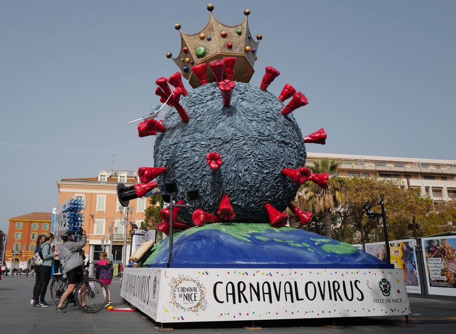 A carnival float depicting the coronavirus is seen in Nice, capital of coastal department of Alpes-Maritimes, southern France, on Feb. 23, 2021. (Photo by Serge Haouzi/Xinhua)