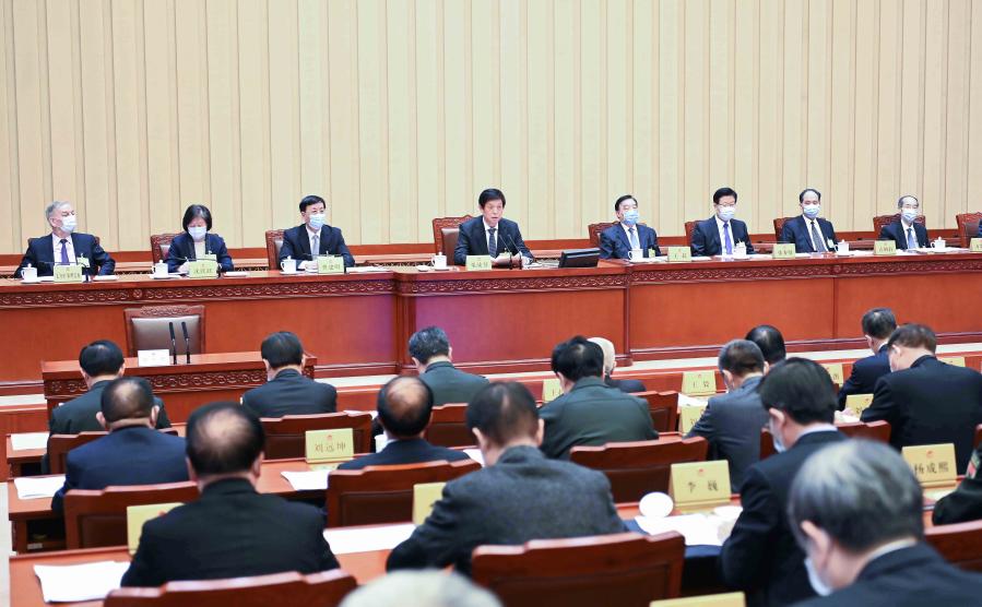 Li Zhanshu, chairman of the National People's Congress (NPC) Standing Committee, presides over the closing meeting of the 26th session of the 13th NPC Standing Committee at the Great Hall of the People in Beijing, capital of China, Feb. 28, 2021. (Xinhua/Li Tao)
