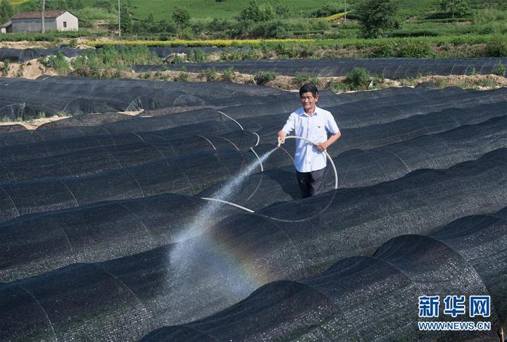 This undated photo shows Sheng Alin spraying water at a white tea seedling base at Huangdu Village, Anji County of east China's Zhejiang Province. /Xinhua