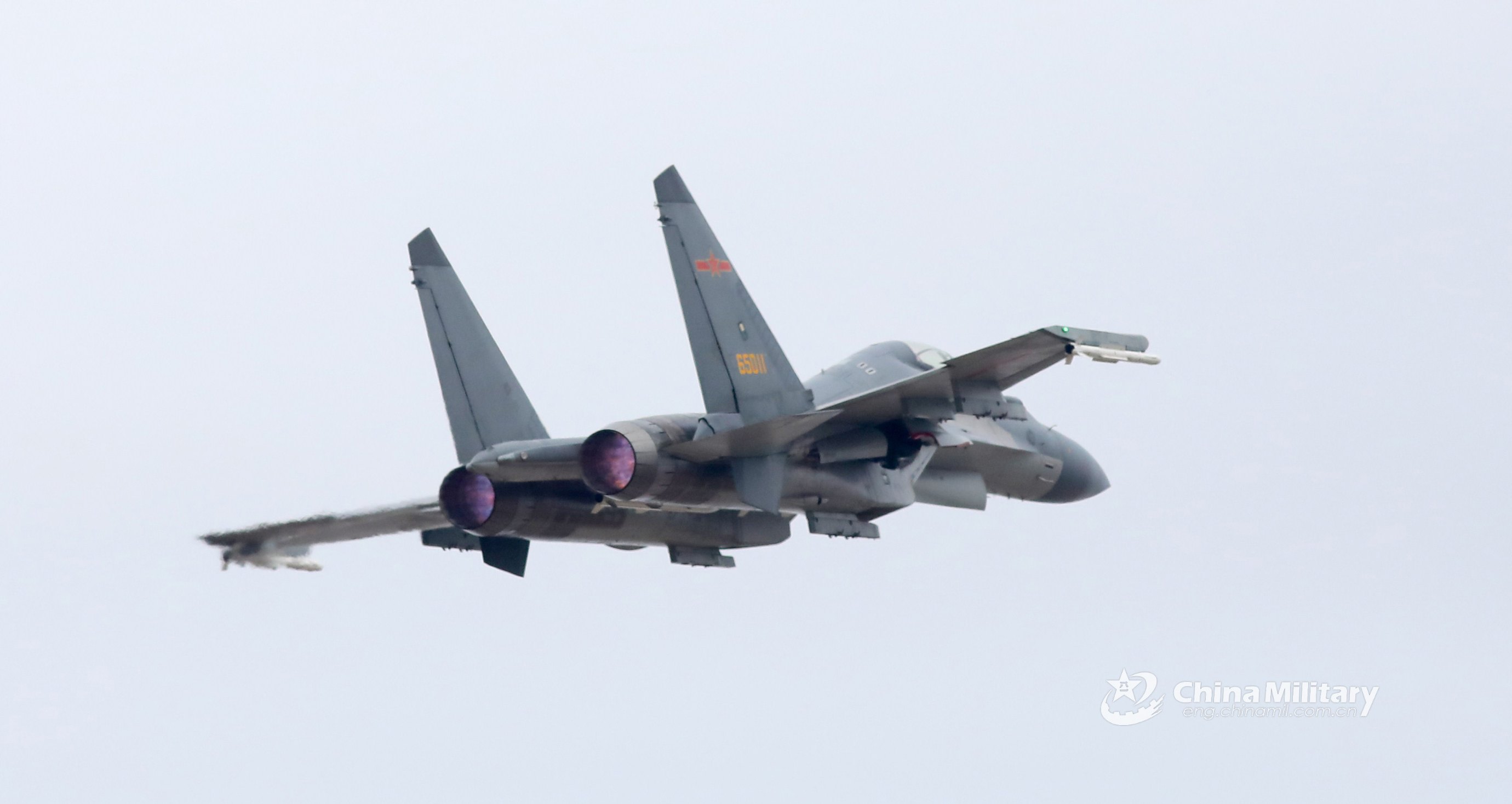 A J-16 fighter jet attached to an aviation brigade of the air force under the PLA Eastern Theater Command soars into the sky during multiple training sorties on February 16, 2021. (eng.chinamil.com.cn/Photo by Li Yehong)