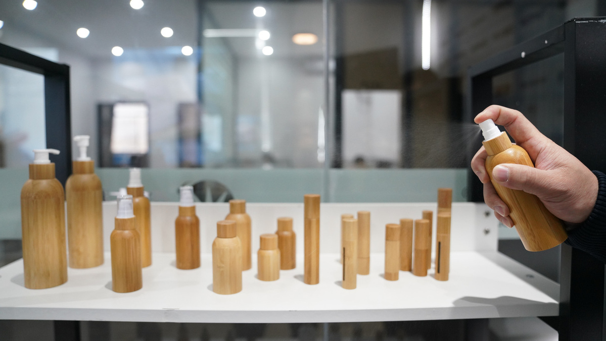A staff member tests a bamboo-made spray bottle. [Photo/Xinhua]