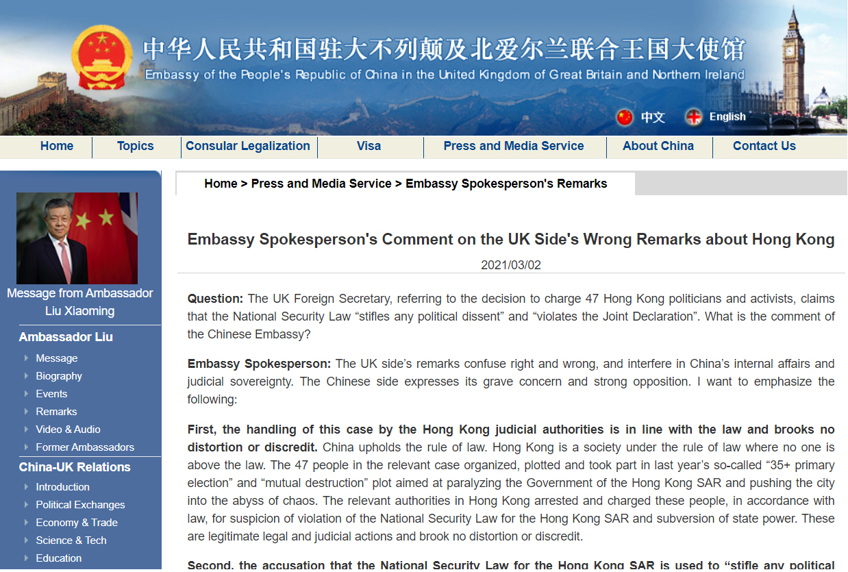 "The UK side's remarks confuse right and wrong, and interfere in China's internal affairs and judicial sovereignty. The Chinese side expresses its grave concern and strong opposition," said a spokesperson for the embassy in a statement.