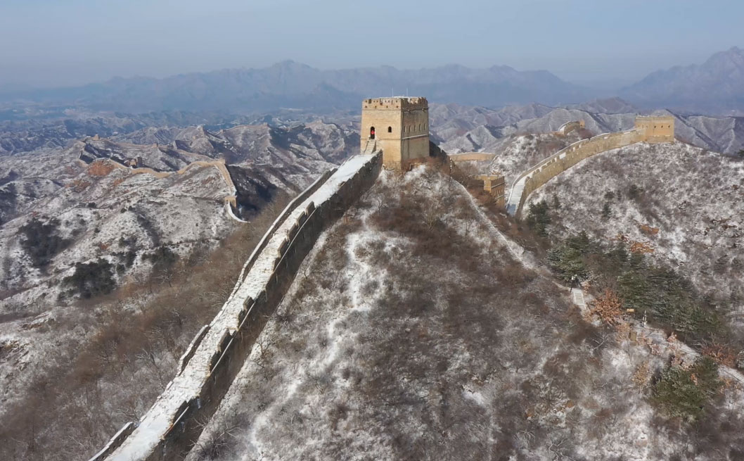 Aerial footage: Snow on Jinshanling Great Wall in Hebei