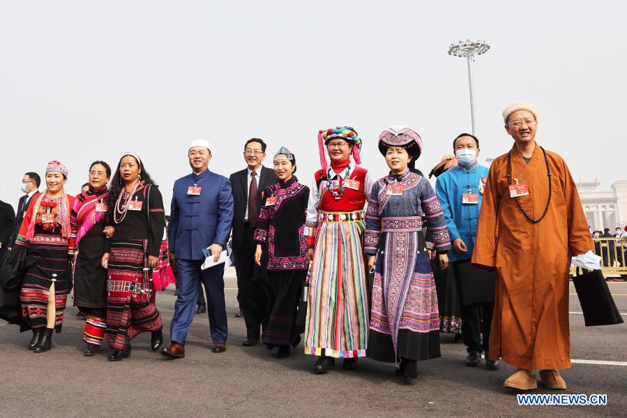 Members of the 13th National Committee of the Chinese People's Political Consultative Conference (CPPCC) walk towards the Great Hall of the People for the opening meeting of the fourth session of the 13th CPPCC National Committee in Beijing, capital of China, March 4, 2021. (Xinhua/Cao Can)