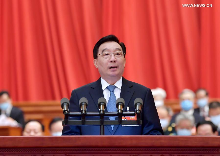 Wang Chen, vice chairman of the Standing Committee of the National People's Congress (NPC), speaks at the opening meeting of the fourth session of the 13th NPC at the Great Hall of the People in Beijing, capital of China, March 5, 2021. Wang read explanatory documents on the draft amendments to the organic law and procedural rules of the NPC and explained a draft decision on improving the electoral system of the Hong Kong Special Administrative Region to national lawmakers at the opening meeting of the fourth session of the 13th NPC. (Xinhua/Li Tao)
