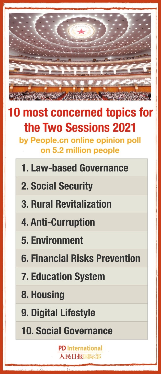 According to an online poll made by People.cn, 5.2 million people took part in discussion on the 2021 Two Sessions (the National People's Congress and the National Committee of the Chinese People's Political Consultative Conference) topics. Law-based Governance, Social Security and Rural Revitalization are most concerned topics this year.