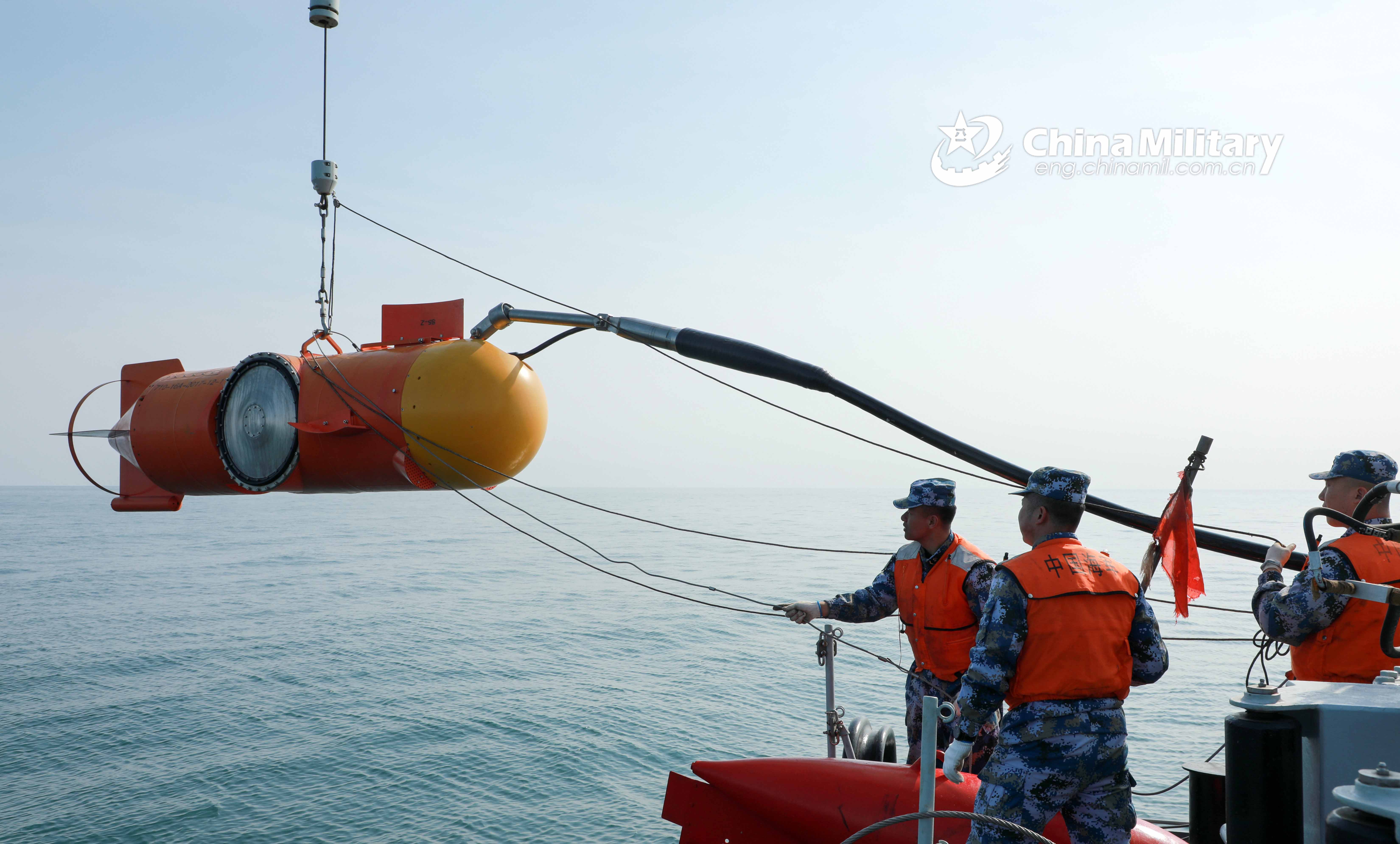 Sailors assigned to a minesweeper group with the navy under the PLA Northern Theater Command prepare to drop the minesweeping gear from the minesweeper during a maritime realistic training exercise on February 23, 2021. (eng.chinamil.com.cn/Photo by Yang Hao)