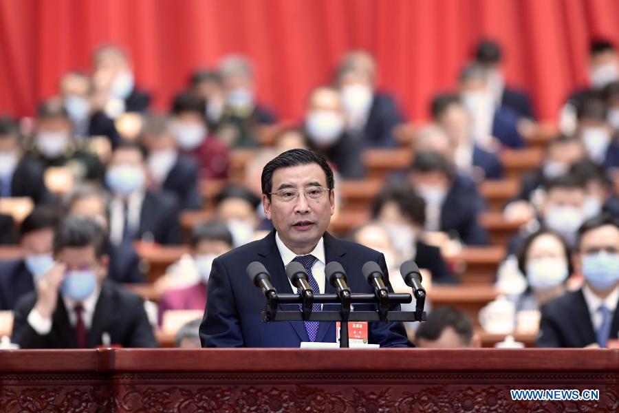 Miao Wei, a member of the 13th National Committee of the Chinese People's Political Consultative Conference (CPPCC), delivers a speech at the second plenary meeting of the fourth session of the 13th CPPCC National Committee at the Great Hall of the People in Beijing, capital of China, March 7, 2021. (Xinhua/Gao Jie)