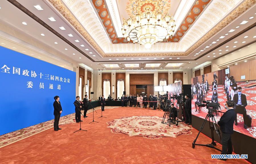 Members of the 13th National Committee of the Chinese People's Political Consultative Conference (CPPCC) are interviewed via video link ahead of the second plenary meeting of the fourth session of the 13th CPPCC National Committee at the Great Hall of the People in Beijing, capital of China, March 7, 2021. (Xinhua/Li Xin)