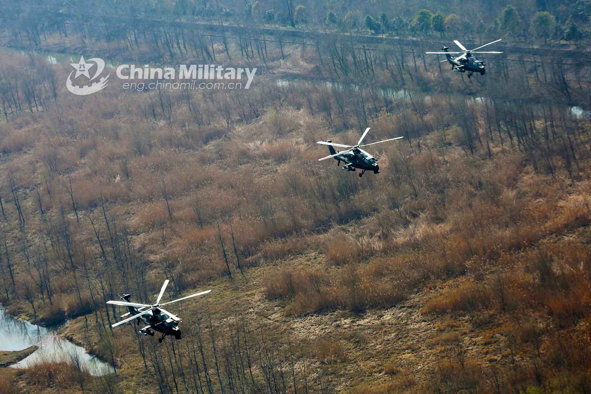 WZ-10 attack helicopters attached to an army aviation brigade under the PLA 72nd Group Army fly over the trees during a formation flight training exercise on February 18, 2021. (eng.chinamil.com.cn/Photo by Sun Mingjian)