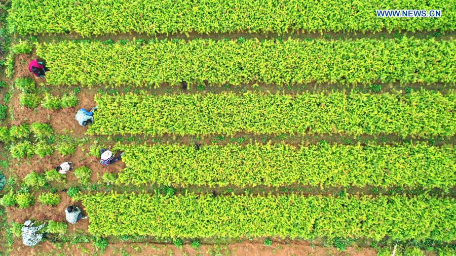 Aerial photo taken on March 7, 2021 shows villagers farming in Yaotian Town of Yongfeng County, Ji'an City, east China's Jiangxi Province. As temperature rises in spring, farmers are busy with farm work across China. (Photo by Liu Haojun/Xinhua)
