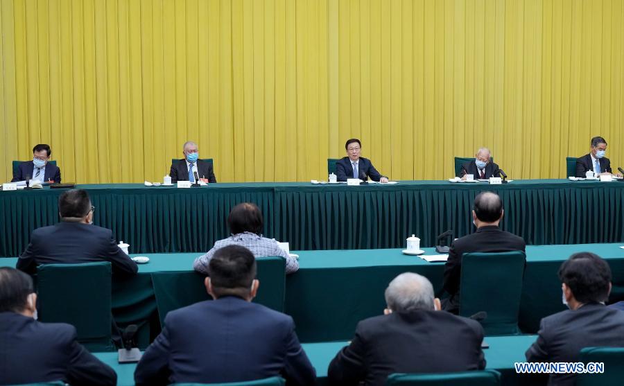 Chinese Vice Premier Han Zheng, also a member of the Standing Committee of the Political Bureau of the Communist Party of China Central Committee, visits national political advisors from Hong Kong and Macao special administrative regions and joins a group discussion with them at the fourth session of the 13th National Committee of the Chinese People's Political Consultative Conference (CPPCC) in Beijing, capital of China, March 6, 2021. (Xinhua/Liu Bin)