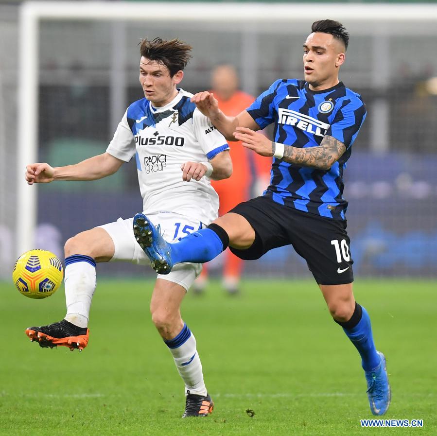 FC Inter's Lautaro Martinez (R) vies with Atalanta's Marten de Roon during a Serie A football match between FC Inter and Atalanta in Milan, Italy, March 8, 2021. (Xinhua)