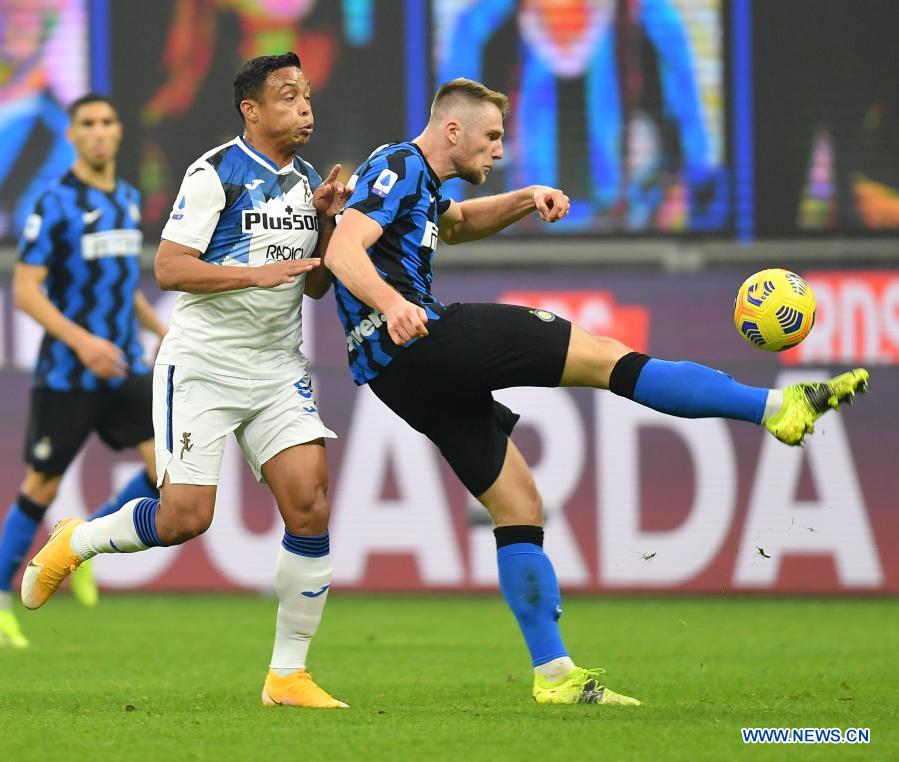 FC Inter's Milan Skriniar (R) vies with Atalanta's Luis Muriel during a Serie A football match between FC Inter and Atalanta in Milan, Italy, March 8, 2021. (Xinhua)
