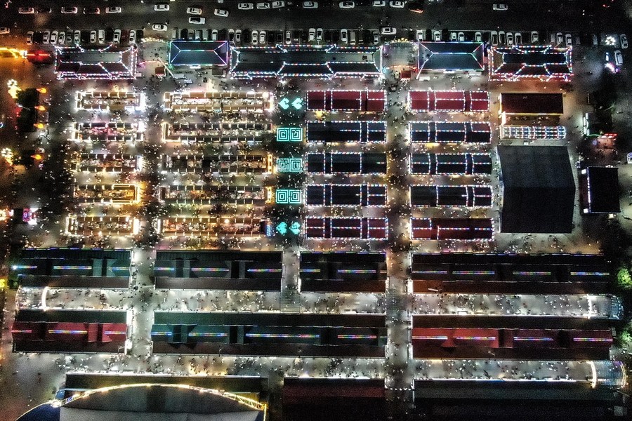 Aerial photo taken on June 7, 2020 shows the Tawan Xingshun International Night Market in Shenyang, northeast China's Liaoning Province. (Xinhua/Pan Yulong)
