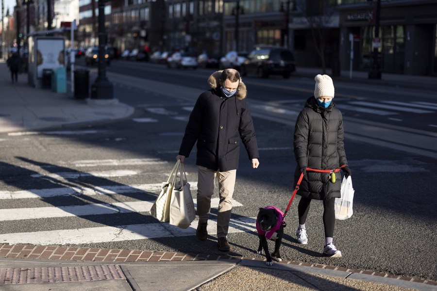People with shopping bags walk on a street in Washington, D.C., the United States, March 5, 2021. (Photo by Ting Shen/Xinhua)
