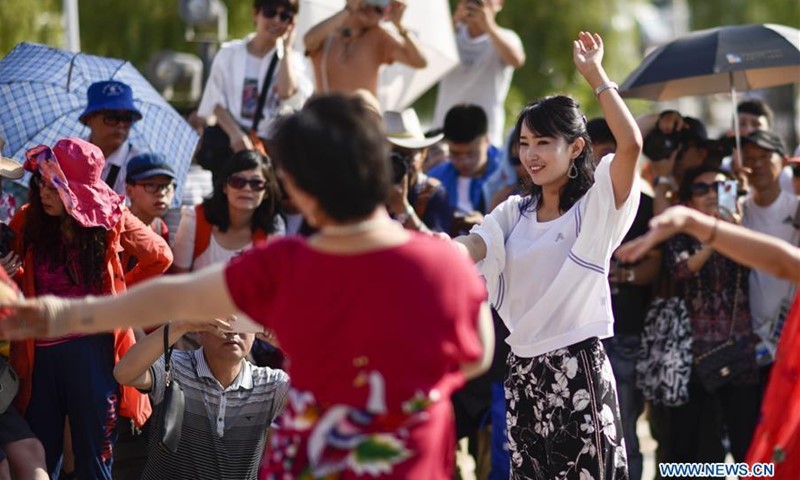 Tourists and local residents dance in the old town of Kashgar, northwest China's Xinjiang Uygur Autonomous Region, July 11, 2018. (Photo/Xinhua)