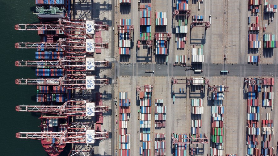 Aerial photo taken on Feb. 22, 2021 shows a container terminal of Tianjin Port in north China's Tianjin Municipality. (Xinhua/Zhao Zishuo)