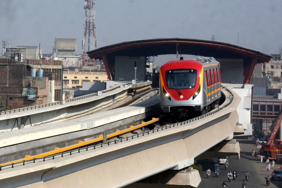 Photo taken on Nov. 8, 2020 shows an Orange Line metro train leaving a station in Pakistan's eastern city of Lahore. (Photo by Sajjad/Xinhua)