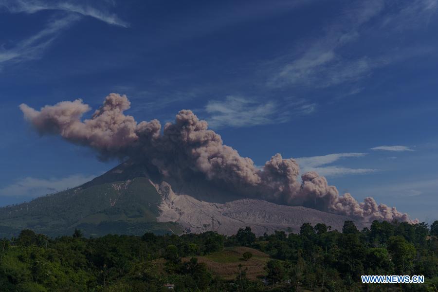 Photo taken on March 11, 2021 shows volcanic materials being spewed from Mount Sinabung, seen from Tiga Pancur village in Karo, North Sumatra, Indonesia. (Photo by Harry Reira/Xinhua)