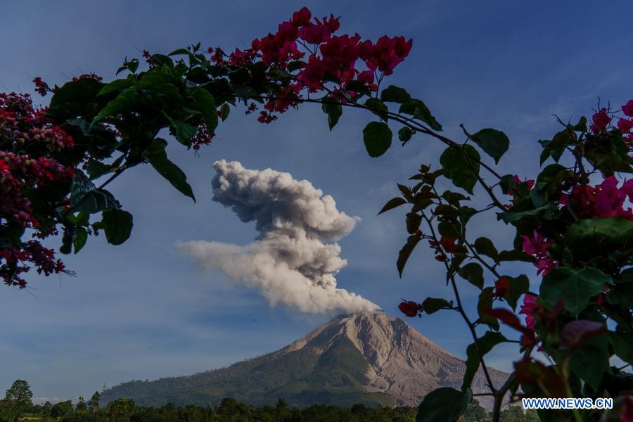 Photo taken on March 11, 2021 shows volcanic materials being spewed from Mount Sinabung, seen from Tiga Pancur village in Karo, North Sumatra, Indonesia. (Photo by Harry Reira/Xinhua)