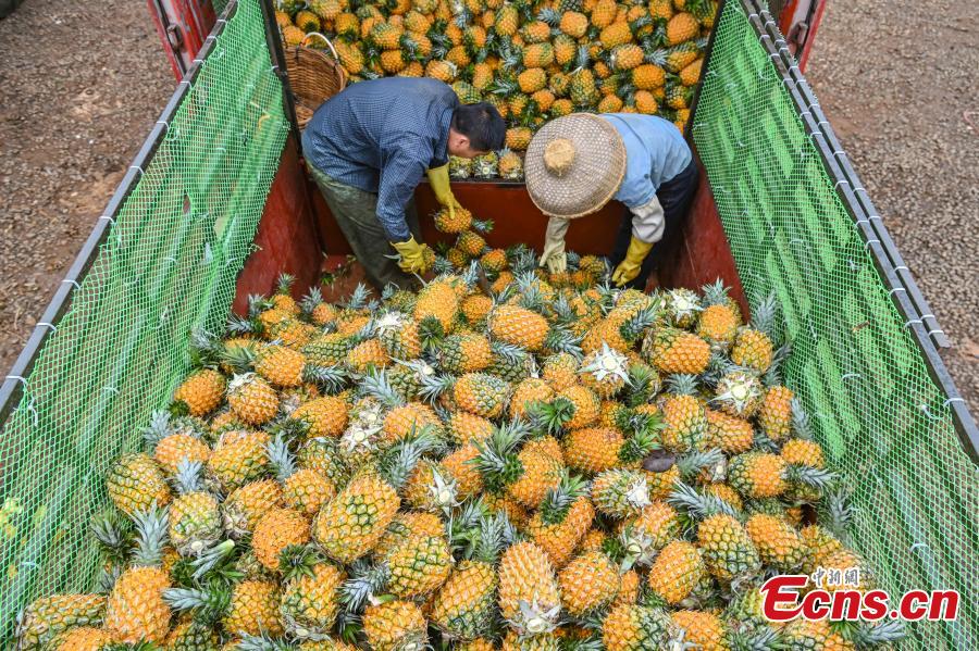 Photo shows a truck loaded with pineapples in Xuwen County, Zhanjiang City, south China's Guangdong Province, March 11, 2021. (Photo/China News Service)