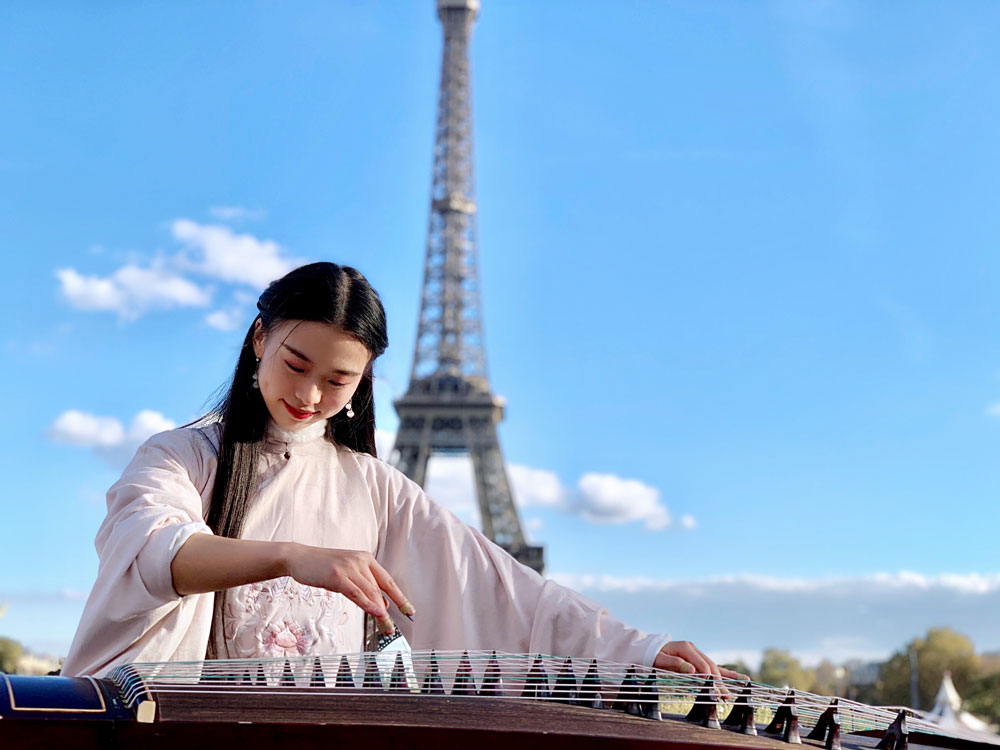 Peng Jingxuan, 26, plays the guzheng, or Chinese zither, to passersby in Paris in October, 2018. CHINA DAILY