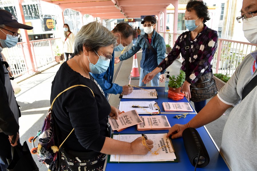 Citizens sign their names during a campaign in support of the decision on improving the electoral system of the Hong Kong Special Administrative Region by the National People's Congress (NPC) in Hong Kong, south China, March 11, 2021. (Xinhua/Lo Ping Fai)