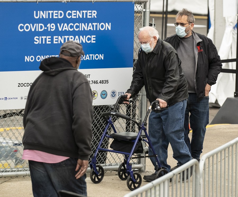 A man heads to a mass COVID-19 vaccination site at the United Center in Chicago, the United States, on March 10, 2021. (Photo by Joel Lerner/Xinhua)