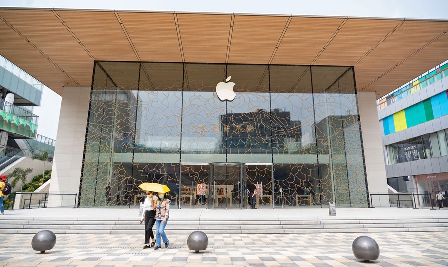 Photo taken on July 16, 2020 shows the exterior of the new Apple retail store in Sanlitun of Beijing, capital of China. (Xinhua/Cai Yang)