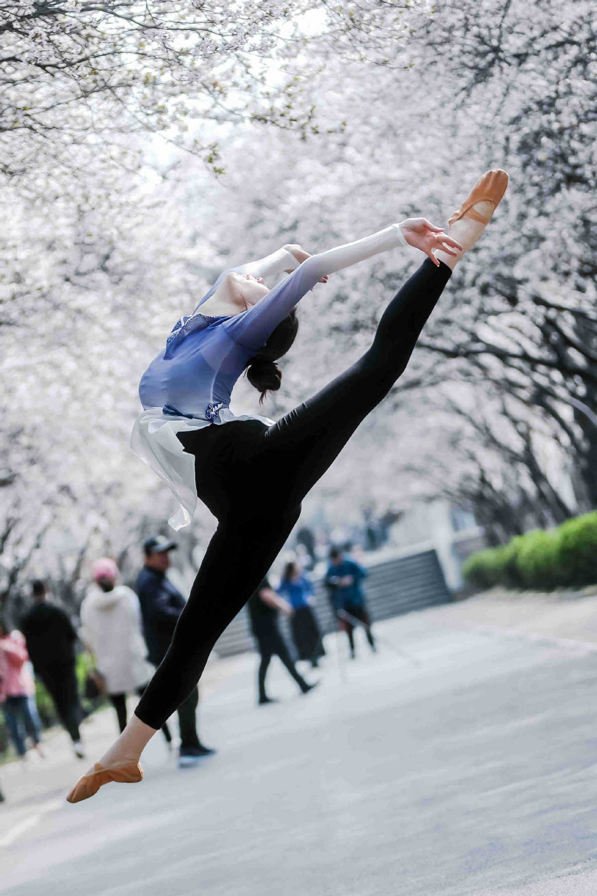 A student from the School of Music of Shandong Normal University is seen dancing at the Qianfo Mountain Campus in Jinan, East China's Shandong province against a backdrop of blooming flowers. [Photo provided to chinadaily.com.cn]